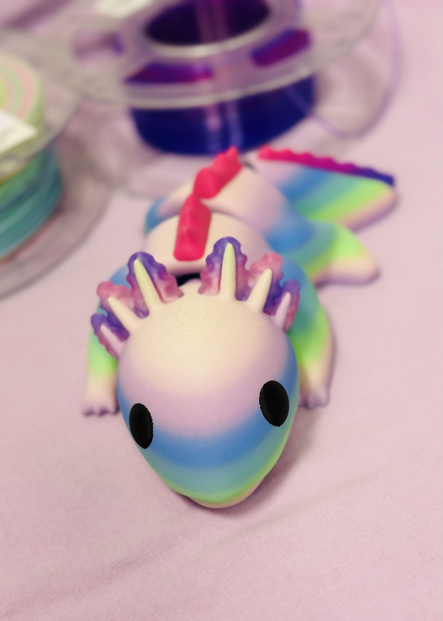 Ce charmant axolotl articulé est une création unique, modélisée et imprimée en 3D par mes soins. Réalisé en dégradé de couleurs pastel arc-en-ciel, il allie douceur visuelle et design ludique. Sa structure articulée lui permet de prendre diverses poses, ce qui en fait un objet décoratif aussi bien qu'un compagnon de jeu original.