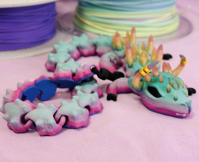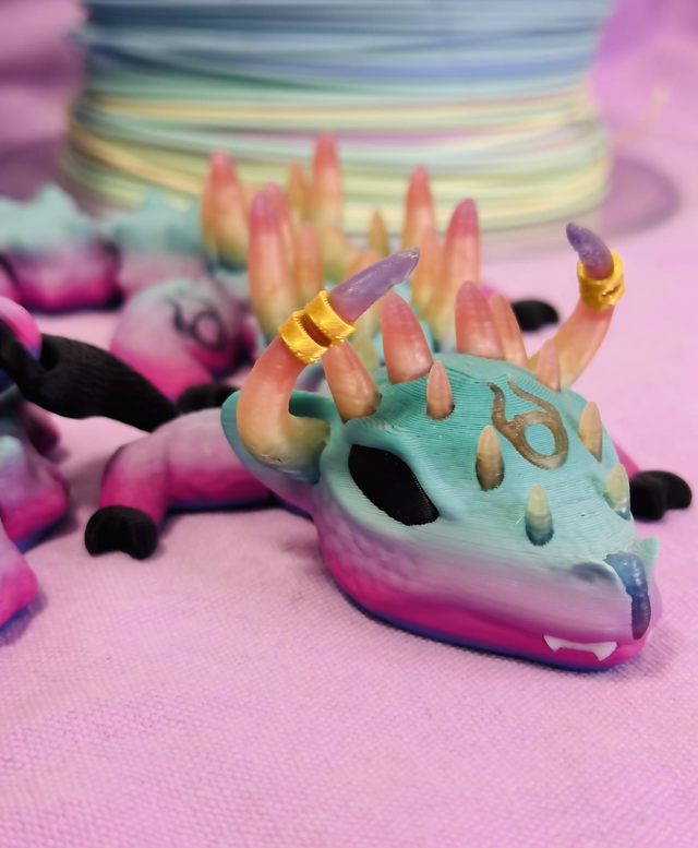 Plonge dans l'univers mystique du zodiaque avec ce dragon articulé inspiré du signe astrologique du Taureau. Conçu avec passion, ce modèle unique allie force et élégance, avec ses cornes dorées, ses piques spectaculaires et ses couleurs douces et vibrantes dans des tons de rose, turquoise et violet.