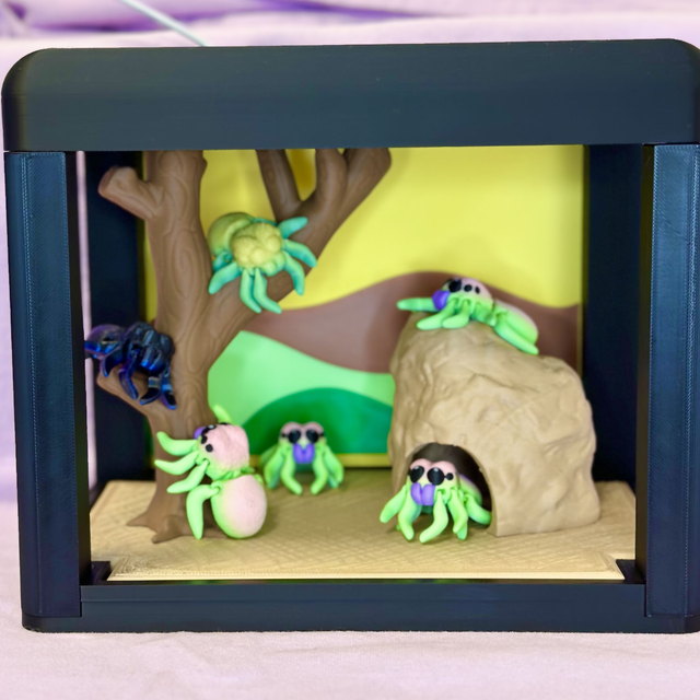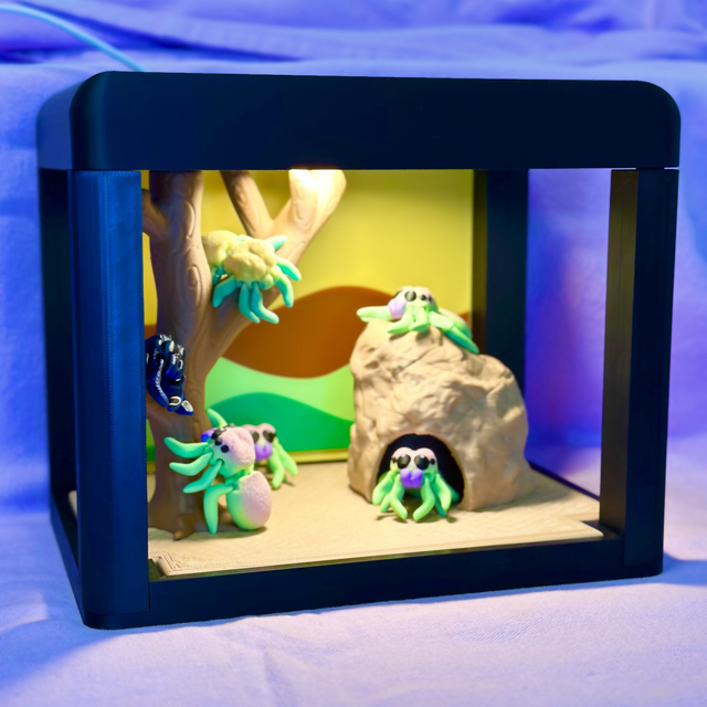 1. Le vivarium: Un cadre noir élégant et épuré qui sert d'écrin à votre scène. Sa structure moderne s'intègre parfaitement sur un bureau, une étagère ou une table de chevet.