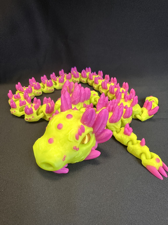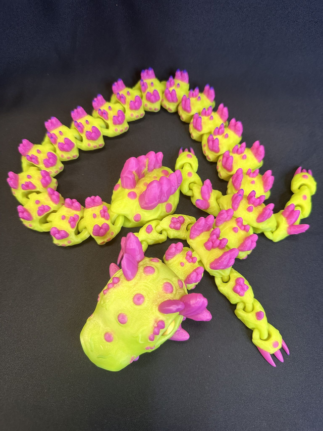 Ce dragon articulé, surnommé « Mutalys », semble tout droit sorti d’un laboratoire oublié ou d’une forêt contaminée par une magie étrange. Sa peau d’un vert vibrant, marquée de pointes violettes, se transforme au contact de la chaleur : à partir de 31°C, il révèle une seconde forme, éclatante et presque irréelle, virant au jaune lumineux et rose vif.